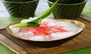Bahan Kuah: 150 ml sirup coco pandan merah 400 ml santan dari 1 butir kelapa 2 lembar daun pandan 4 ons es batu