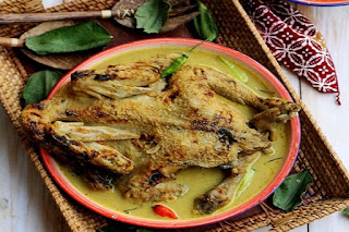 Bahan: 1 ekor ayam kampung muda ½ liter air ¾ liter santan dari 1 butir kelapa 8 buah cabe rawit utuh 2 ½ sendok teh garam 1 ½ sendok teh gula merah 2 batang serai, memarkan 2 lembar daun jeruk, buang tulang daunnya 1 cm jahe, memarkan 2 sendok makan minyak goreng